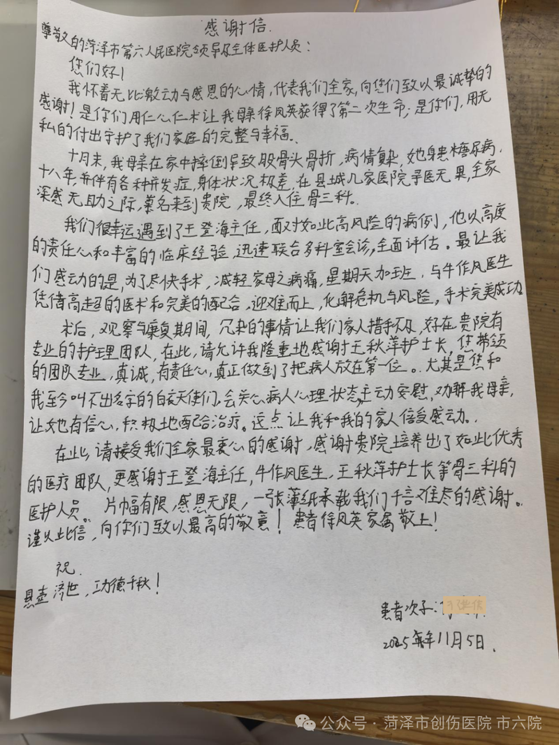 当术后第一天,徐女士在医护人员的搀扶下成功下床行走时,儿子红着眼眶哽咽道:“是他们用仁心仁术,给了我母亲第二次生命!”在随后送来的手写感谢信中,家属用朴实的文字写道:“从绝望到希望,是菏泽市创伤医院(市六院)骨三科的医护们不放弃、不退缩,用专业和爱心拯救了我们全家。”