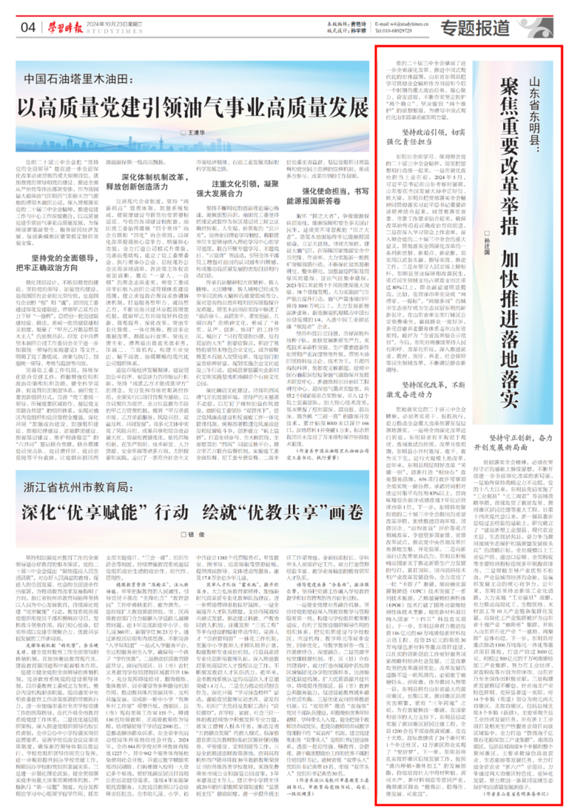 《学习时报》2024年10月23日第四版刊发东明县委书记孙迁国署名文章——《聚焦重要改革举措 加快推进落地落实》。